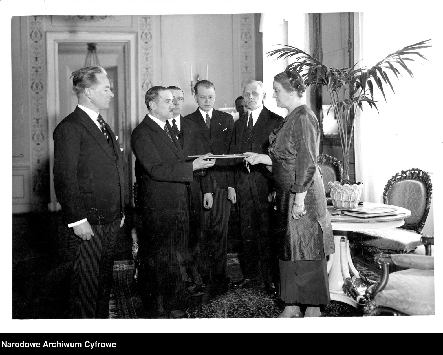 Na zdjęciu dokumentującym tę chwilę widoczny jest m.in. komisarz rządowy Franciszek Hołodka – drugi od lewej – który pełnił wówczas jedną z najważniejszych funkcji administracyjnych w mieście. Jego obecność podkreśla wagę wydarzenia, w którym lokalna władza reprezentowała społeczność Suwałk wobec osoby bliskiej Marszałkowi.