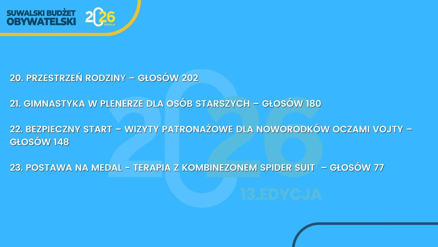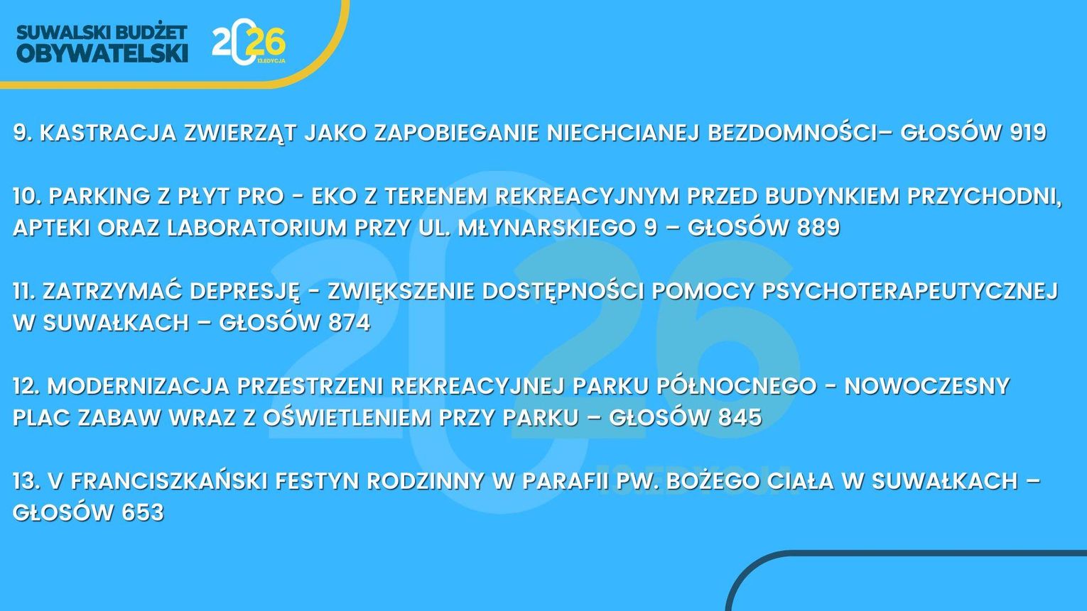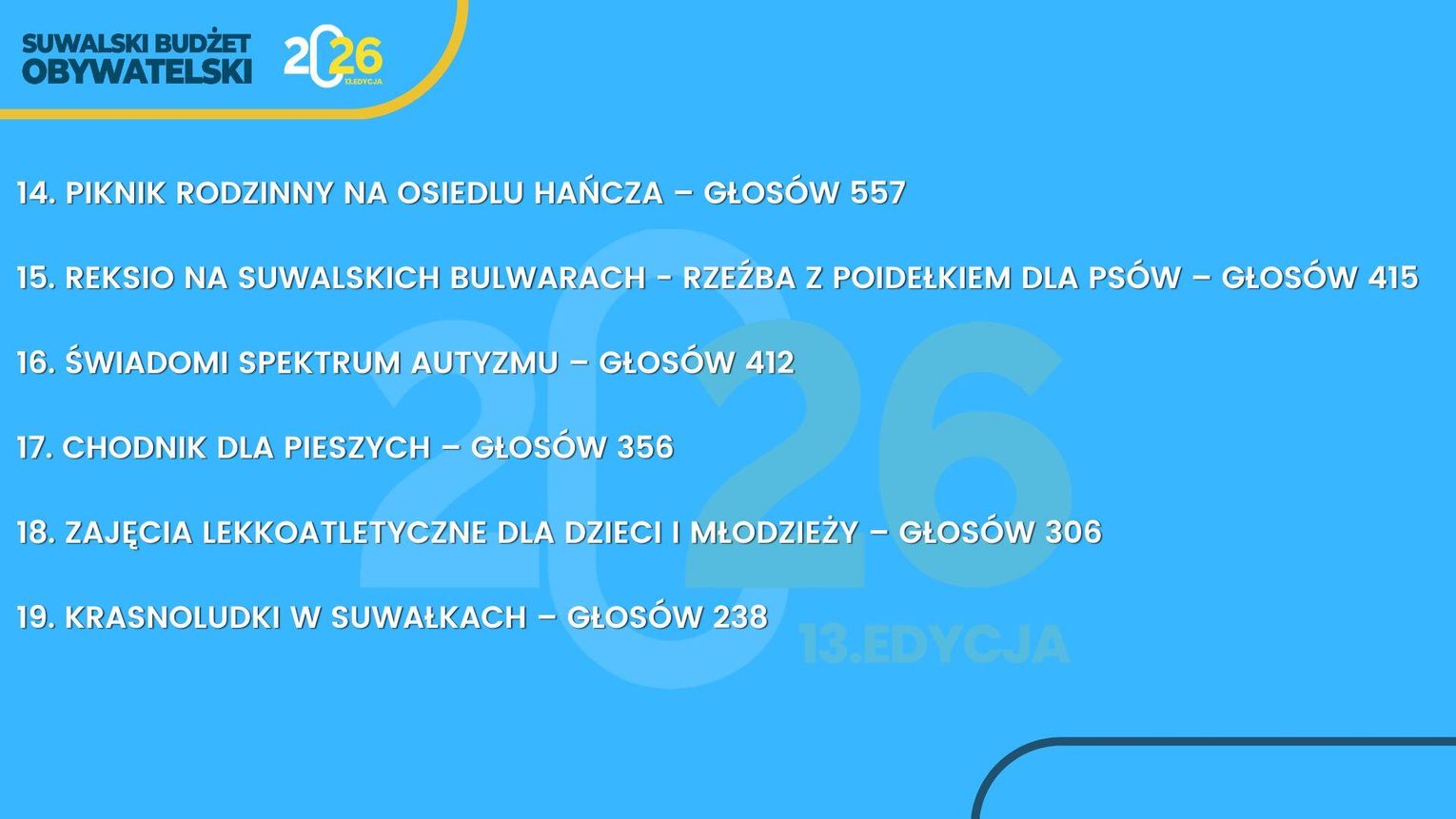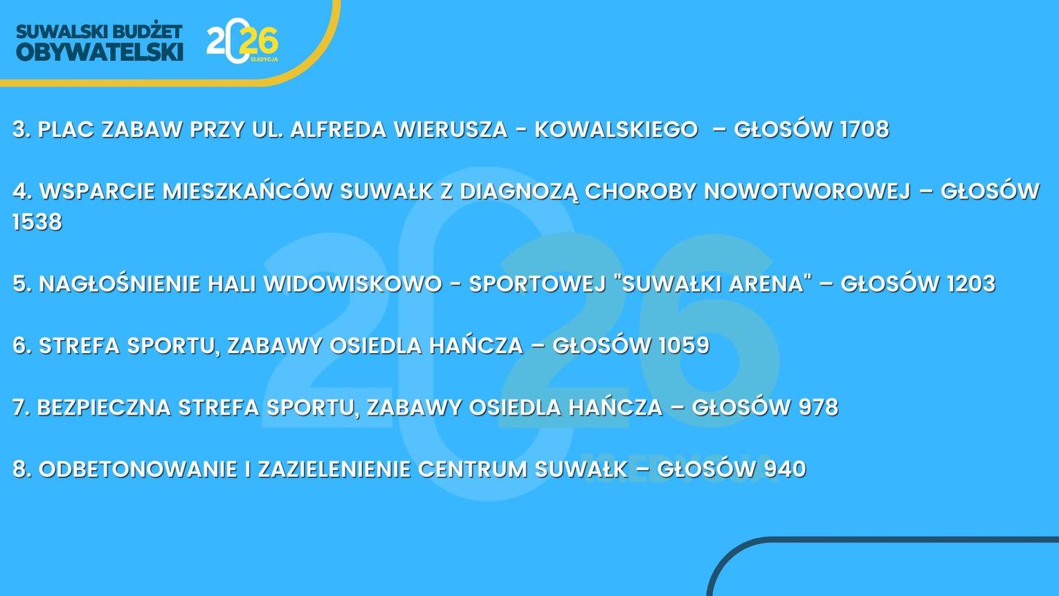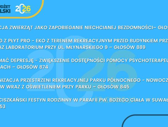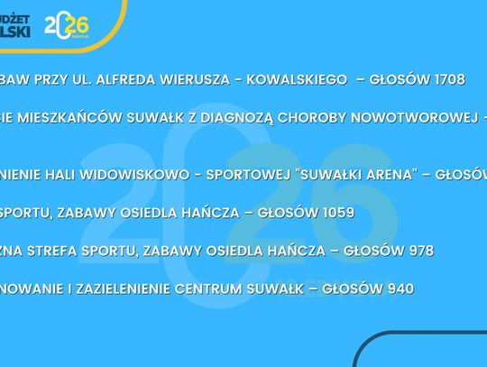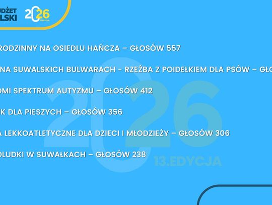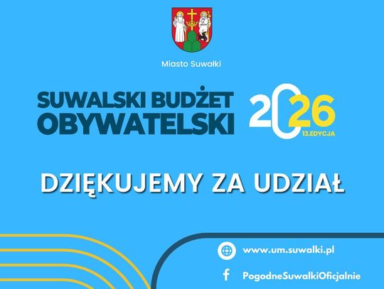 Suwalski Budżet Obywatelski to nie tylko procedura – to przede wszystkim realna siła społecznej zmiany, która rodzi się z inicjatywy mieszkańców. Dziękujemy wszystkim, którzy zgłosili swoje pomysły i wzięli udział w głosowaniu. Dzięki Wam Suwałki stają się jeszcze bardziej przyjaznym i otwartym miejscem do życia.