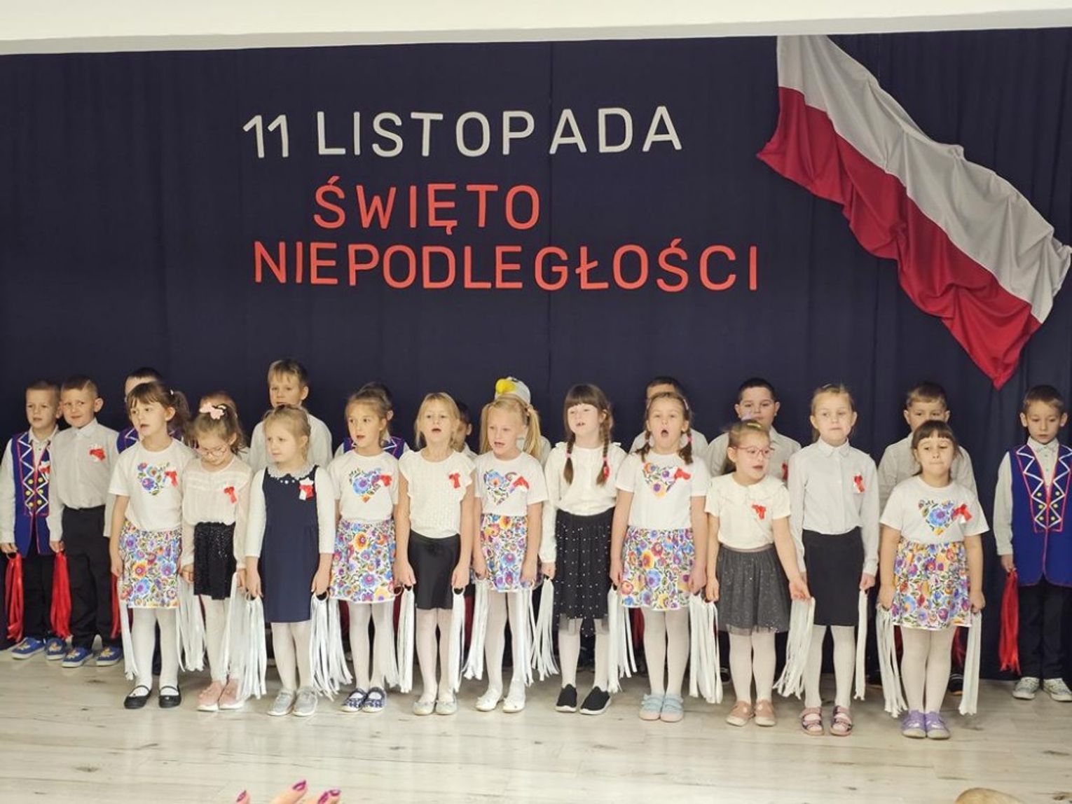 Dzieci śpiewały „Przybyli ułani pod okienko”, „Jesteśmy Polką i Polakiem” oraz „Co to jest niepodległość?” 🎶 – wzruszając nauczycieli 👩🏫 i zaproszonych rodziców 👨👩👧👦.