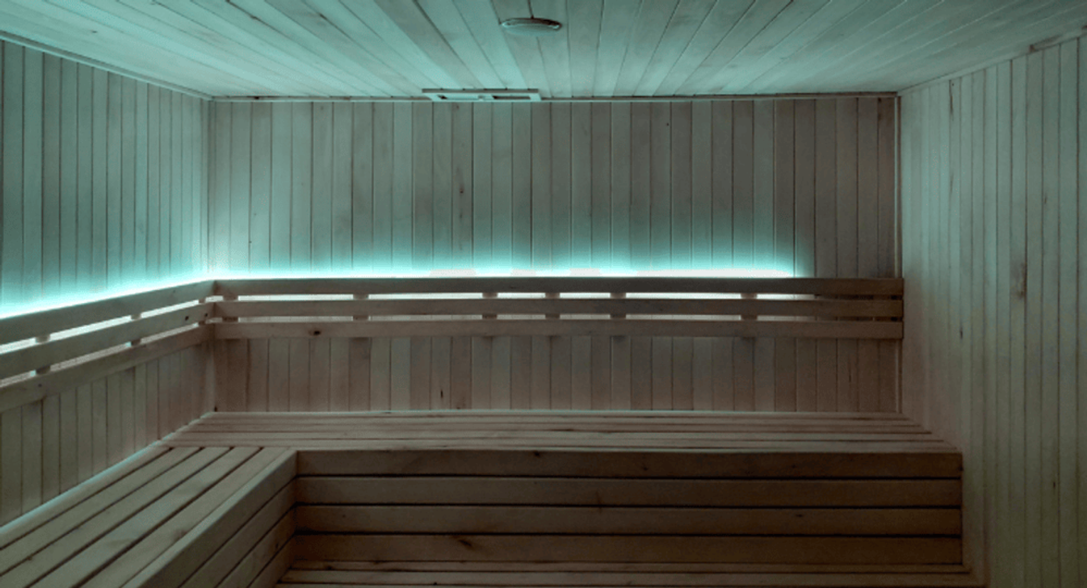 W saunie zamontowano nowoczesne, delikatne światła LED, które tworzą przyjemny, kojący klimat.