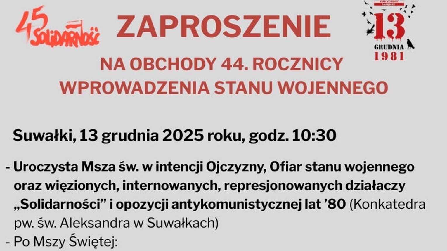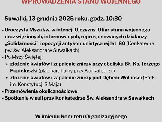 Zwieńczeniem obchodów będzie spotkanie uczestników w auli przy Konkatedrze św. Aleksandra, stanowiące okazję do rozmów, wspomnień oraz wymiany refleksji na temat współczesnego znaczenia rocznicy 13 grudnia.