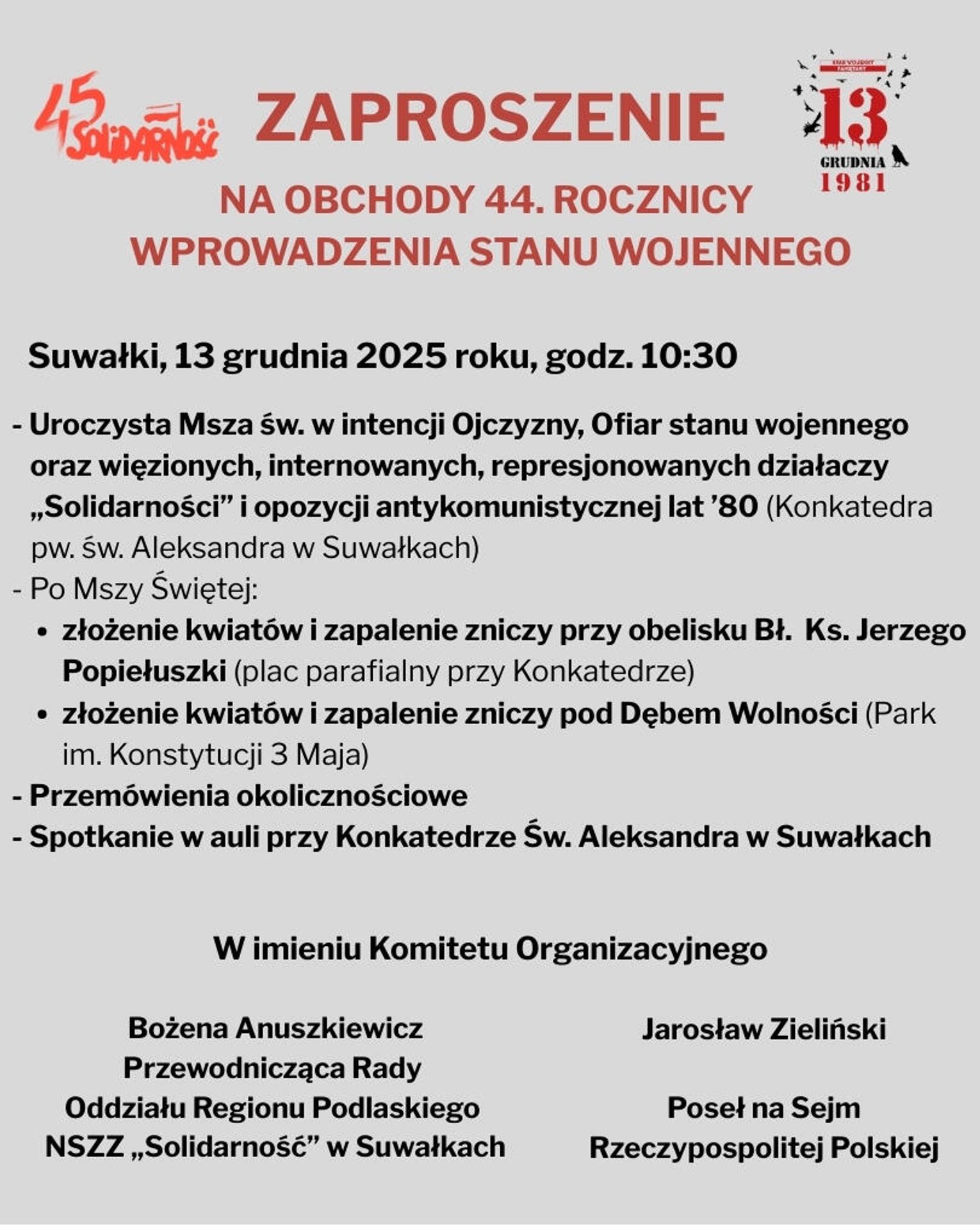 Wydarzenie organizowane jest w imieniu Komitetu Organizacyjnego przez Bożenę Anuszkiewicz, przewodniczącą Rady Oddziału Regionu Podlaskiego NSZZ „Solidarność” w Suwałkach, oraz Jarosława Zielińskiego, posła na Sejm Rzeczypospolitej Polskiej.