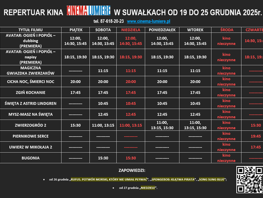 W najbliższy weekend kino Cinema Lumiere w Suwałkach zaprasza widzów na aż trzy nowe tytuły, które trafią na wielki ekran. To świetna okazja, by spędzić grudniowe dni z dobrym kinem — zarówno rodzinnie, jak i w gronie przyjaciół.
