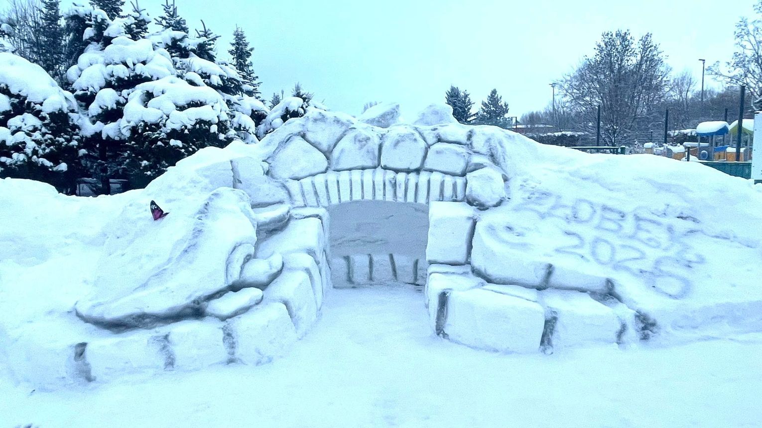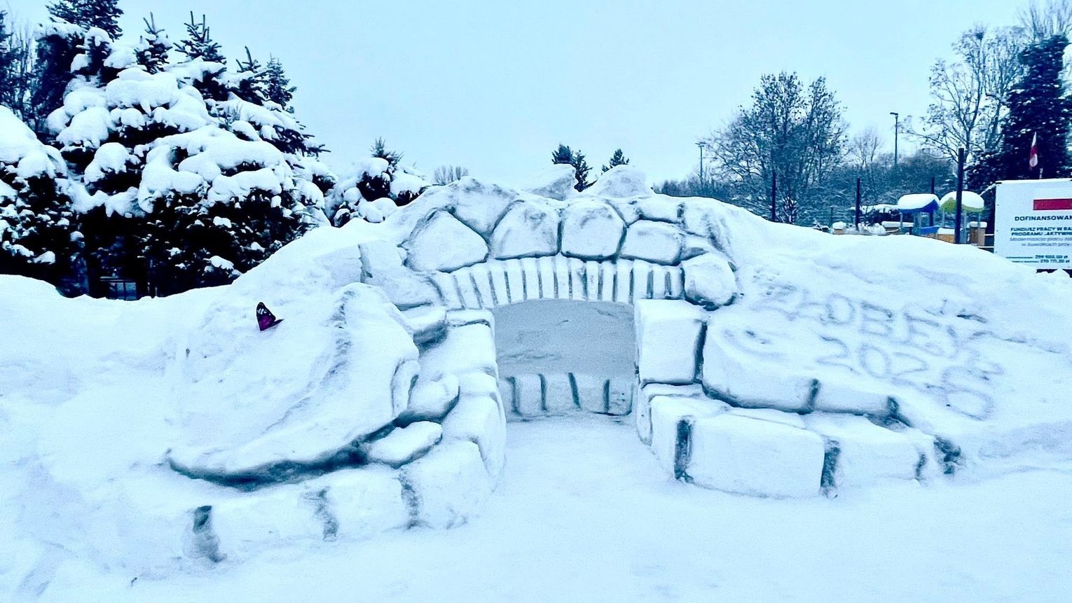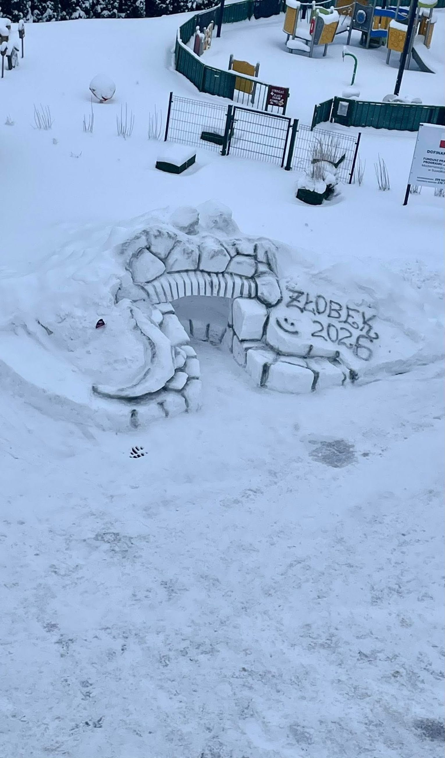 Autorem zimowej instalacji jest pan Wiesław, kierowca pracujący w żłobku, który dzięki swojej wyobraźni, talentowi i zaangażowaniu stworzył małą śnieżną krainę czarów. Budowla od pierwszych chwil przyciąga uwagę i wywołuje uśmiech – szczególnie u najmłodszych.