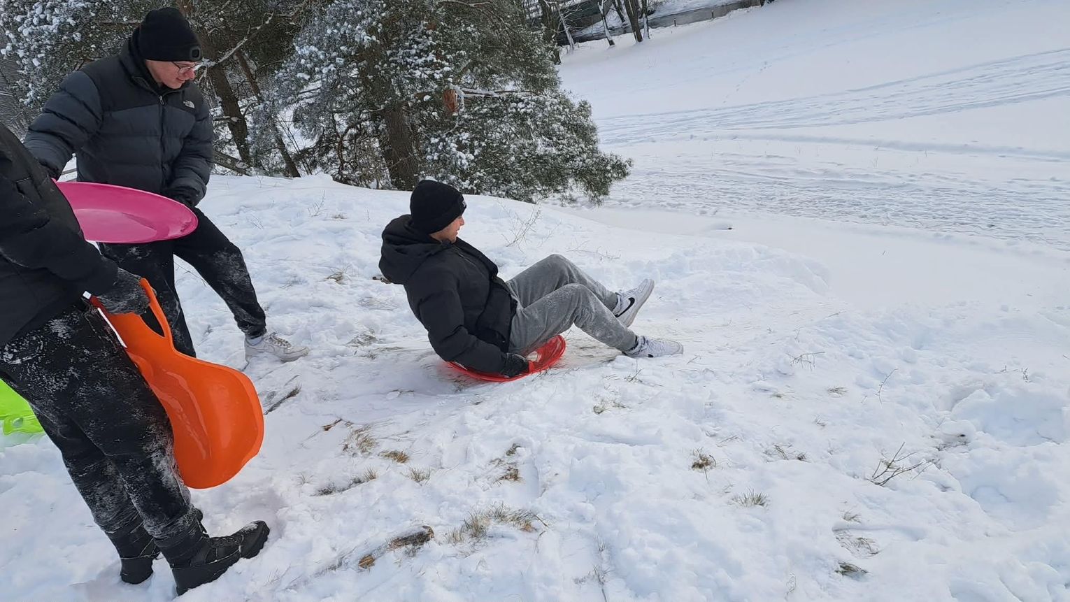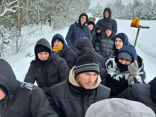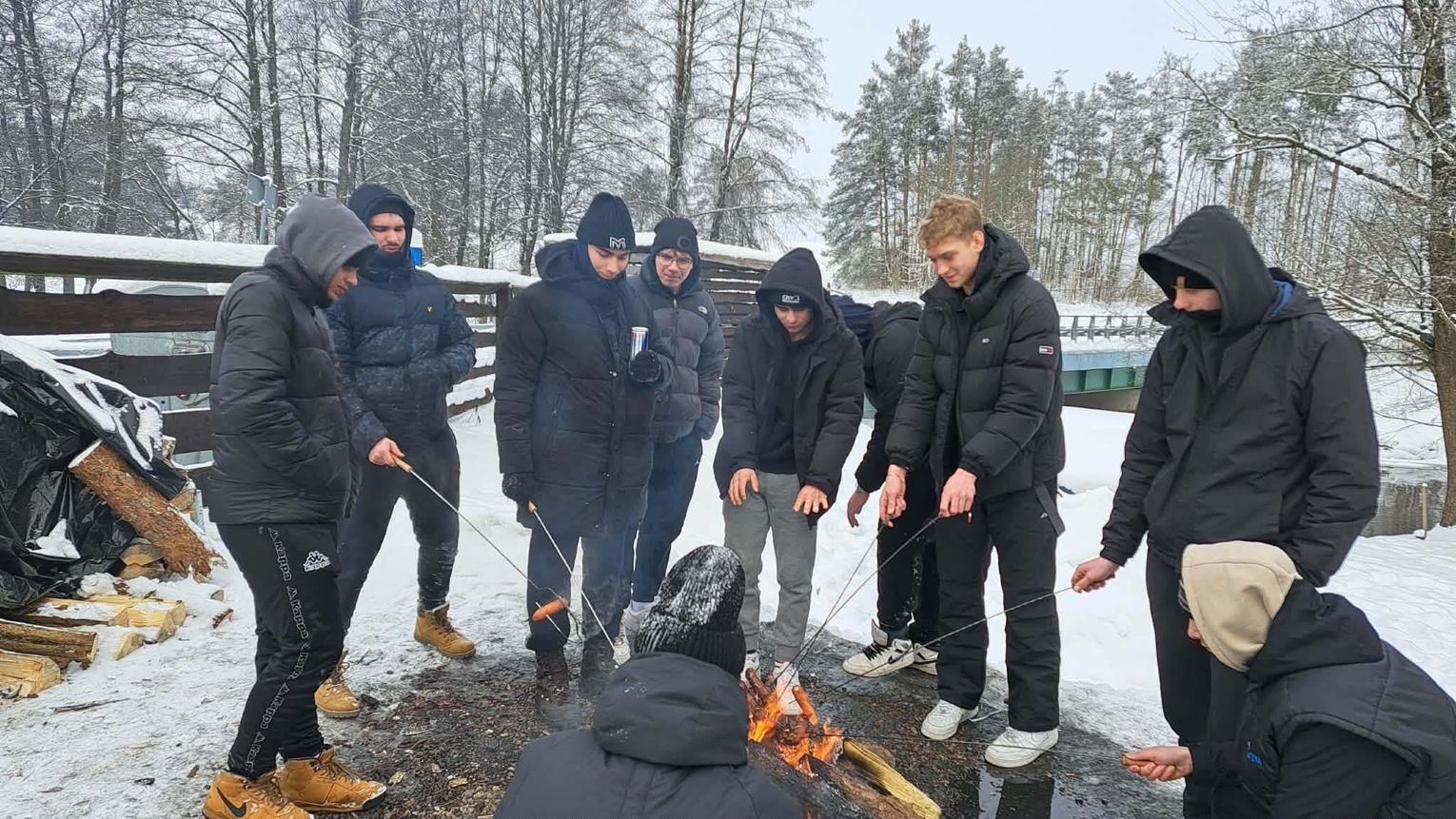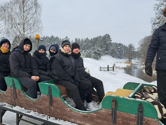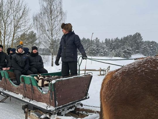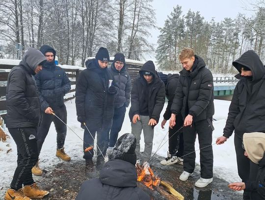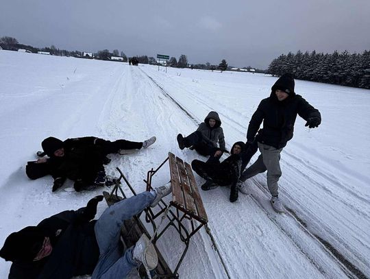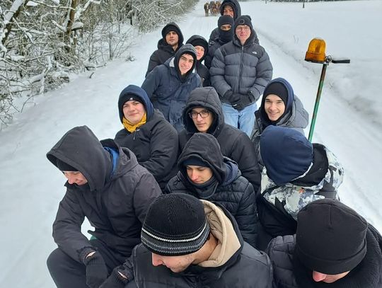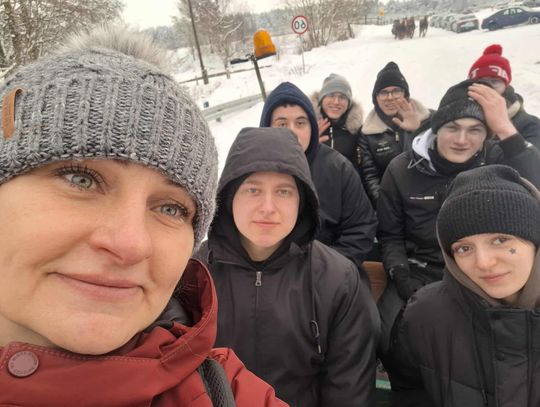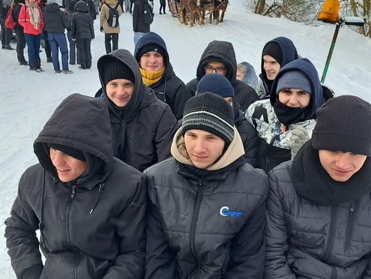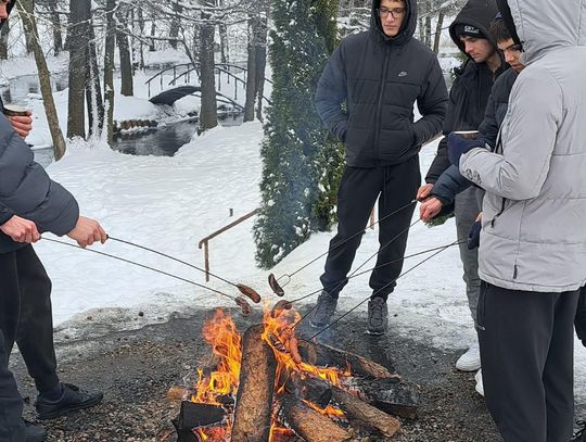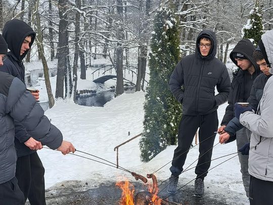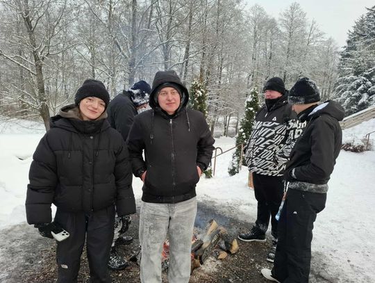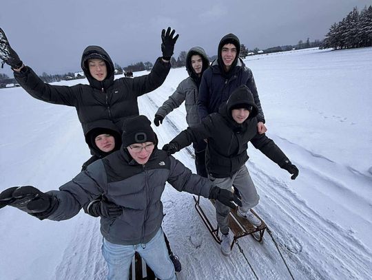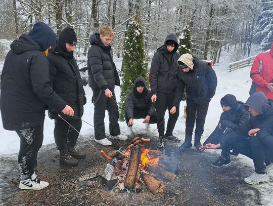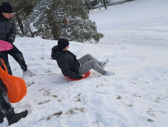 Przejażdżka saniami była tylko początkiem atrakcji. Uczniowie chętnie korzystali również ze zjazdów na jabłuszkach, które dostarczyły wielu emocji i wywołały mnóstwo uśmiechów. Po intensywnych zabawach przyszedł czas na chwilę odpoczynku przy ognisku, gdzie można było się ogrzać i skosztować pieczonych kiełbasek. Ciepła atmosfera sprzyjała rozmowom i wspólnemu spędzaniu czasu.
