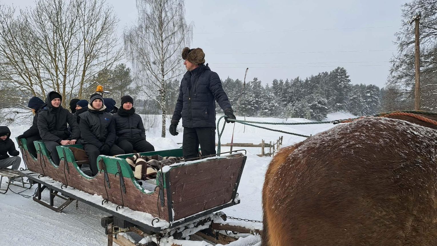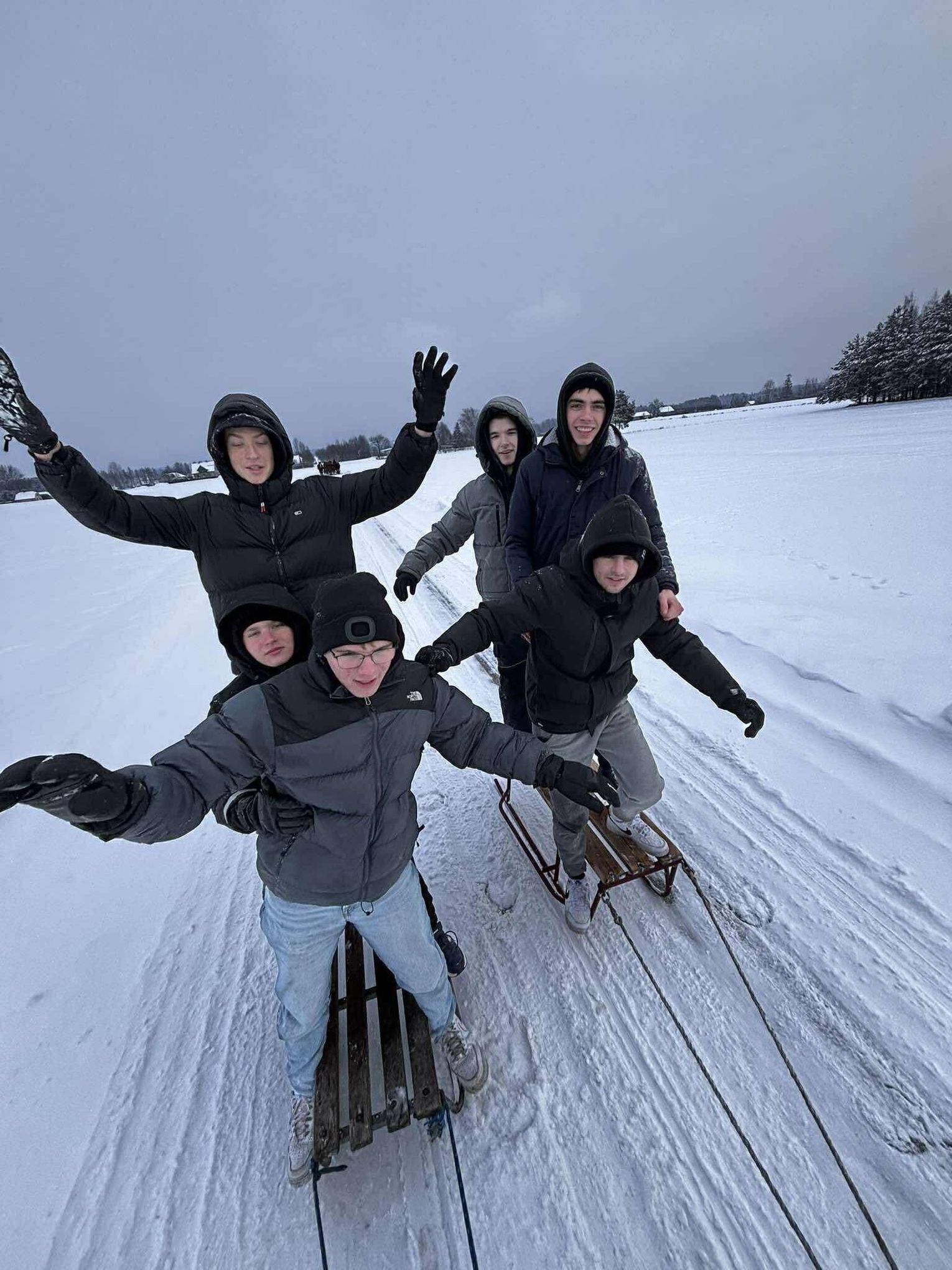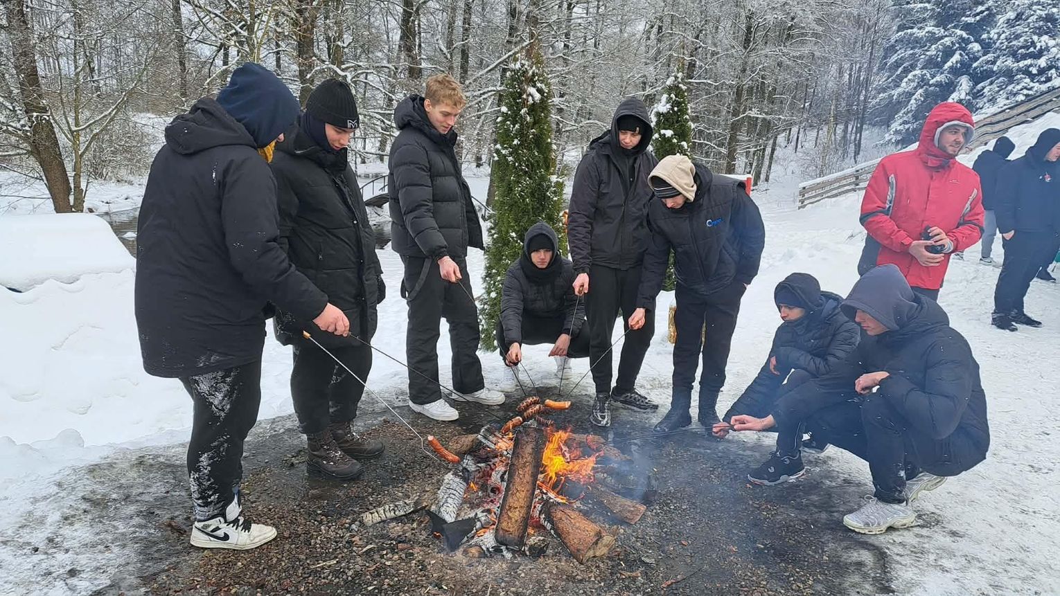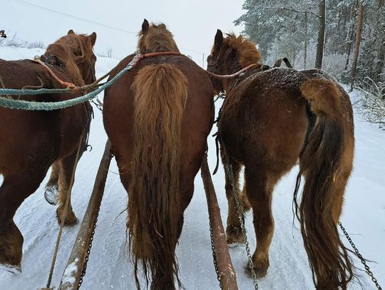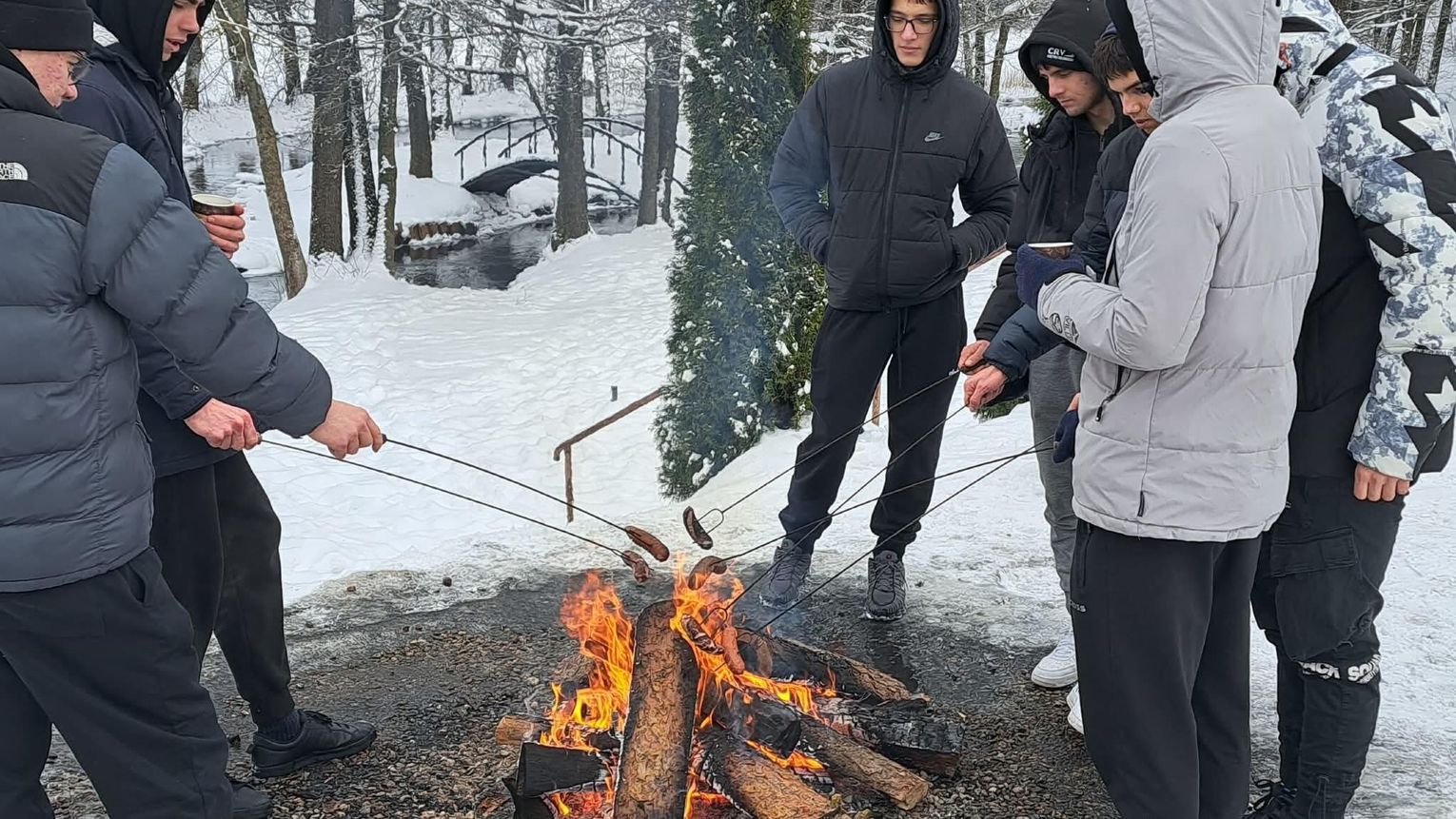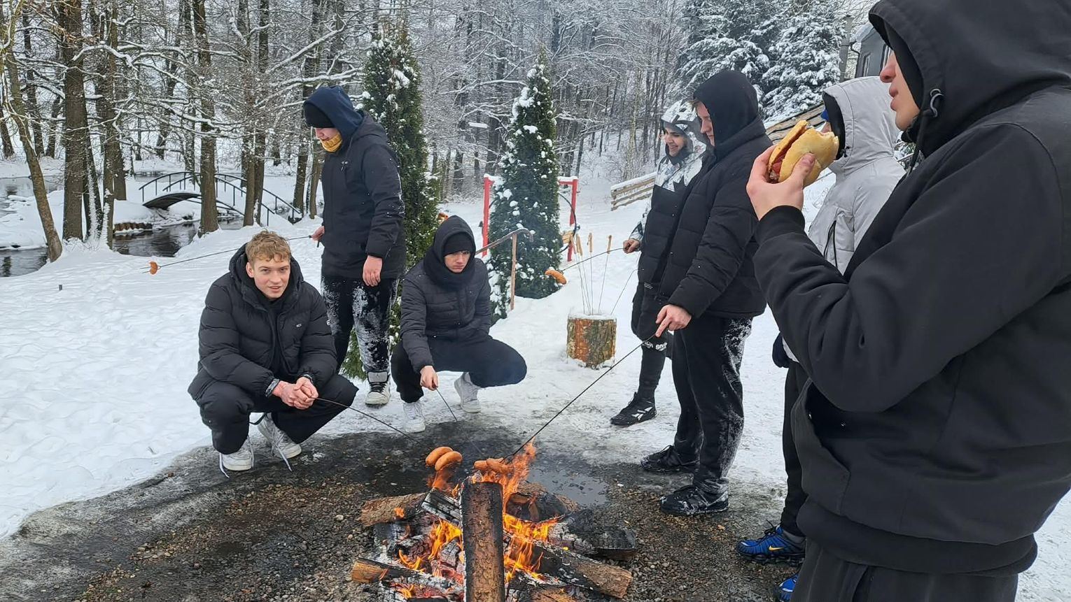 Przejażdżka saniami była tylko początkiem atrakcji. Uczniowie chętnie korzystali również ze zjazdów na jabłuszkach, które dostarczyły wielu emocji i wywołały mnóstwo uśmiechów. Po intensywnych zabawach przyszedł czas na chwilę odpoczynku przy ognisku, gdzie można było się ogrzać i skosztować pieczonych kiełbasek. Ciepła atmosfera sprzyjała rozmowom i wspólnemu spędzaniu czasu.