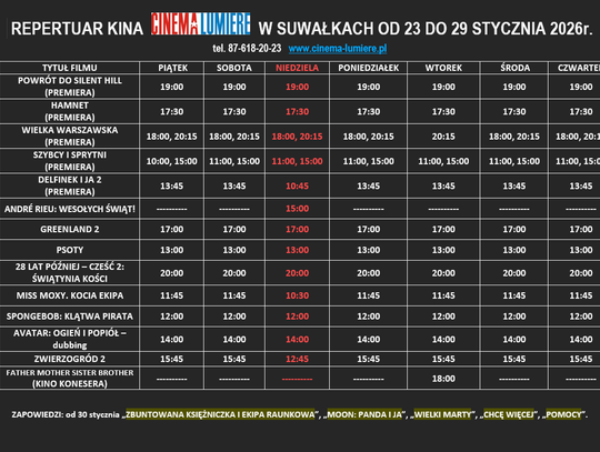 Pełen repertuar dostępny jest na załączonym zdjęciu oraz na stronie kina.