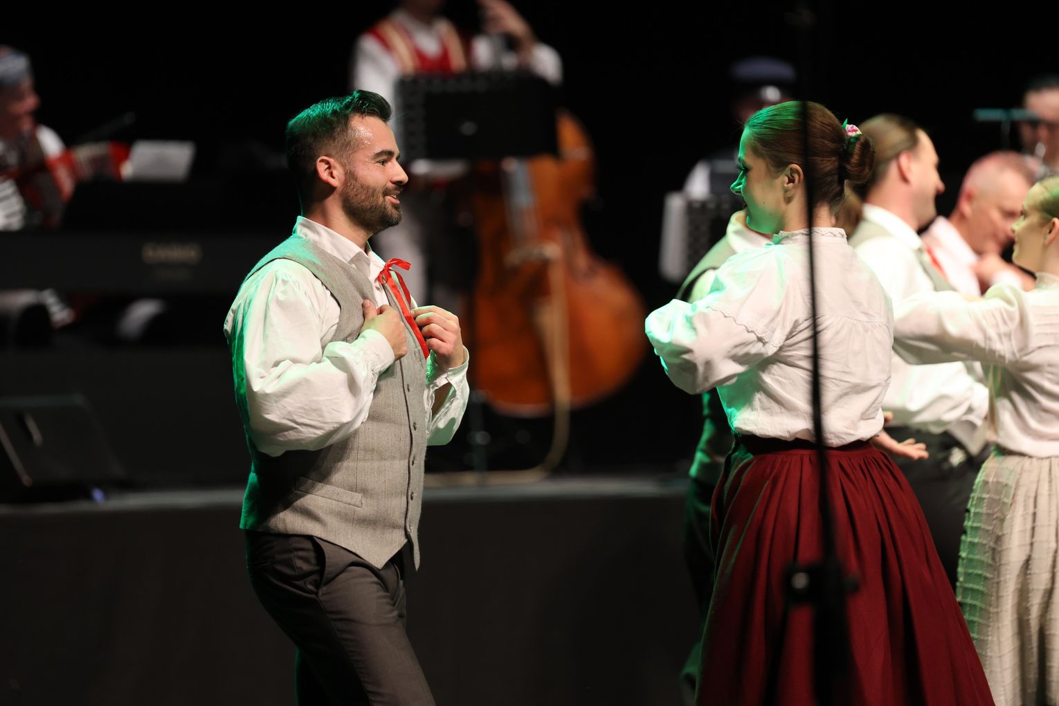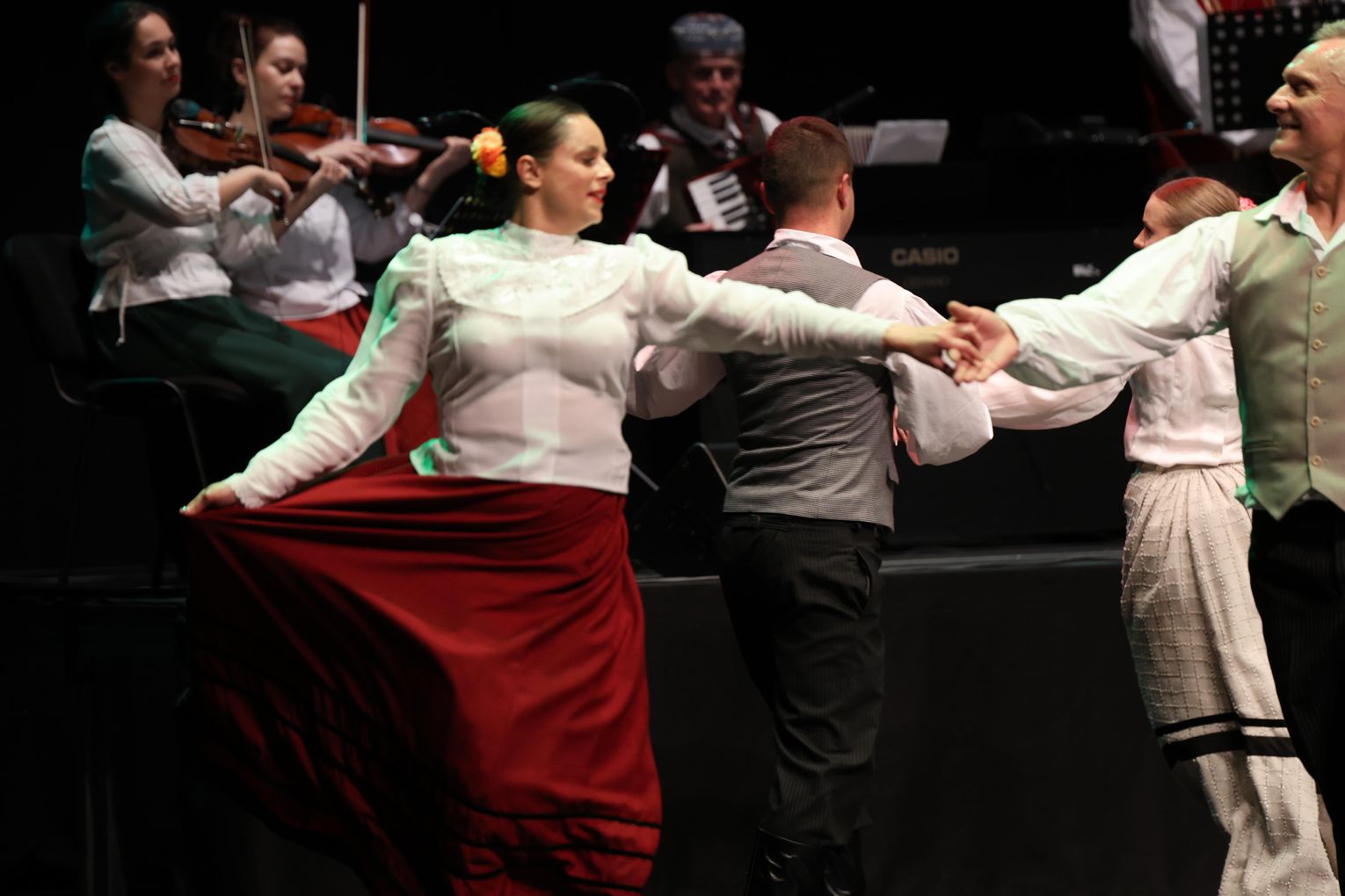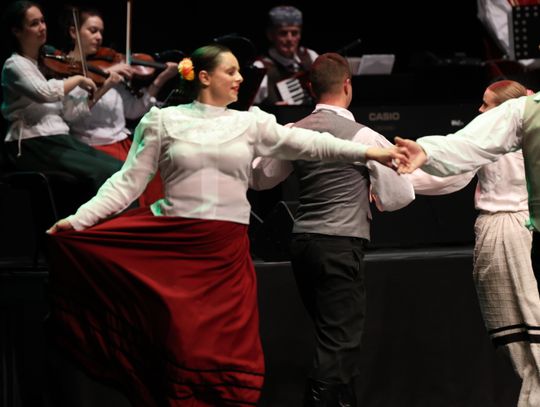 Tego wieczoru scena wypełniła się energią, kolorem i radością płynącą z polskiego folkloru. Widzowie mieli okazję podziwiać bogaty program artystyczny, na który złożyły się m.in. tańce suwalskie, krakowskie oraz opoczyńskie, zaprezentowane z niezwykłą dynamiką i dbałością o tradycję.