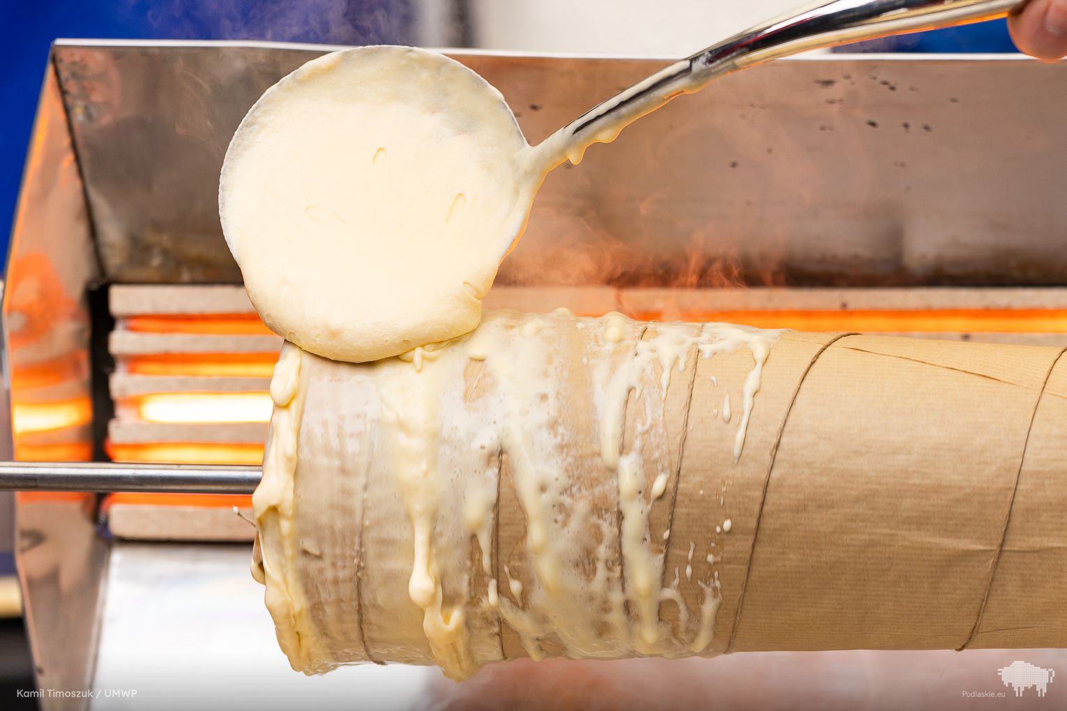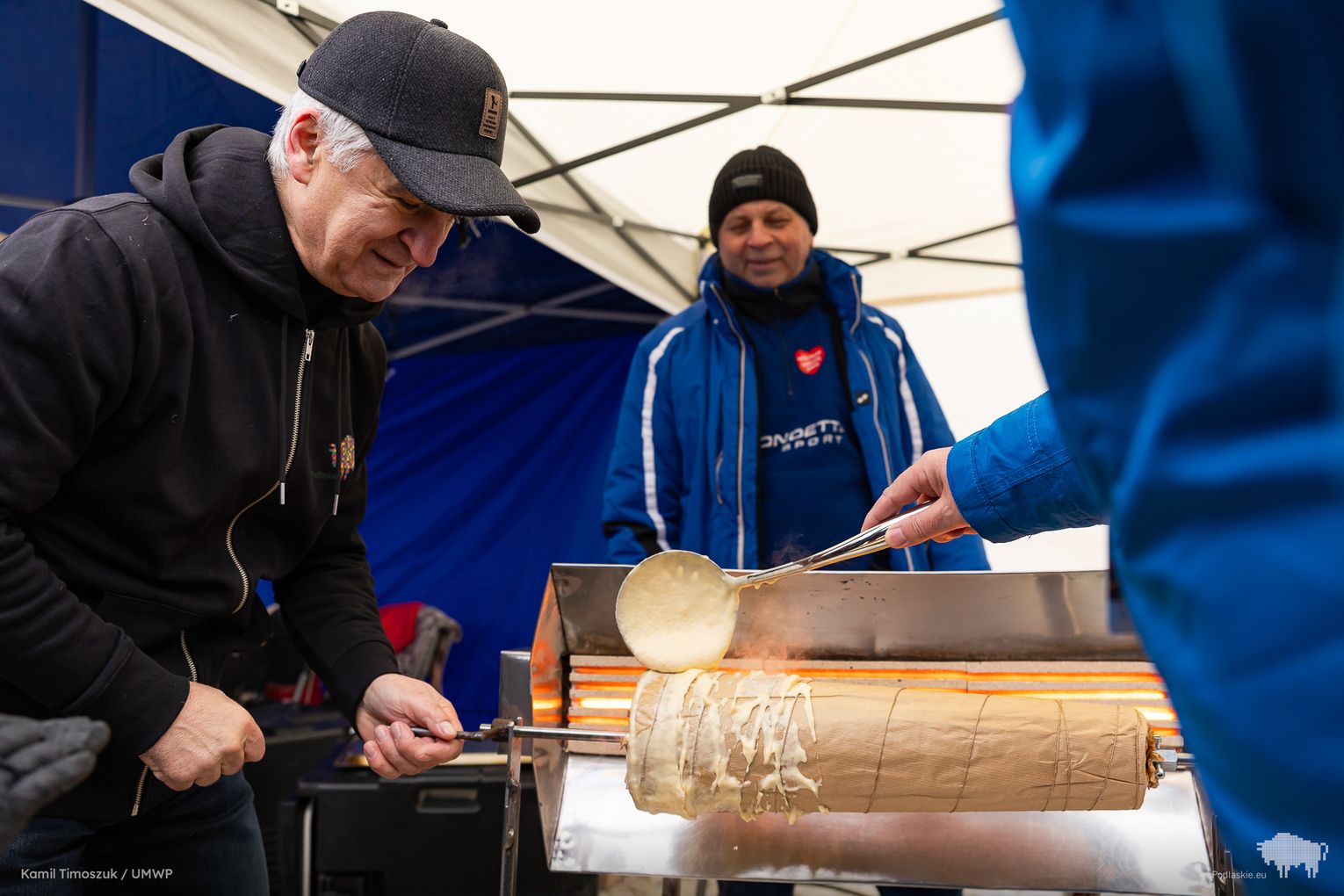 W niedzielne popołudnie, 25 stycznia, na Rynku Zygmunta Augusta w Augustowie można było z bliska obserwować proces powstawania jednego z najbardziej rozpoznawalnych przysmaków regionu – sękacza. Ciasto ważyło ponad cztery kilogramy i powstało z wykorzystaniem 45 jaj od podlaskich kur 🥚🍰