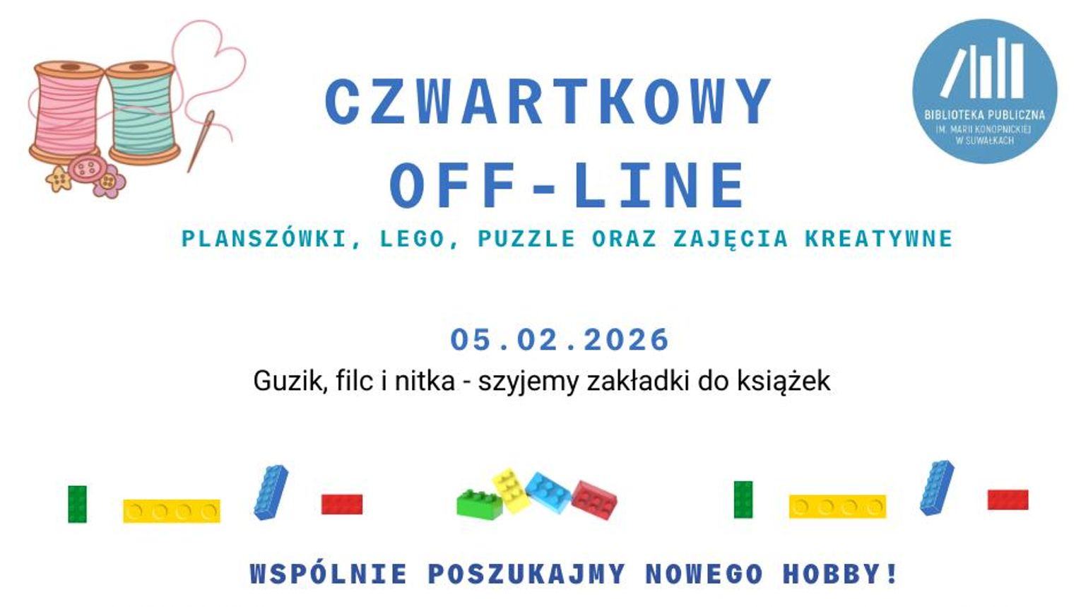 W lutowej odsłonie OFF-LINE uczestnicy spróbują swoich sił w szyciu. Podczas zajęć „Guzik, filc i nitka – szyjemy zakładki do książek” powstaną własnoręcznie wykonane, kolorowe dodatki do ulubionych lektur.