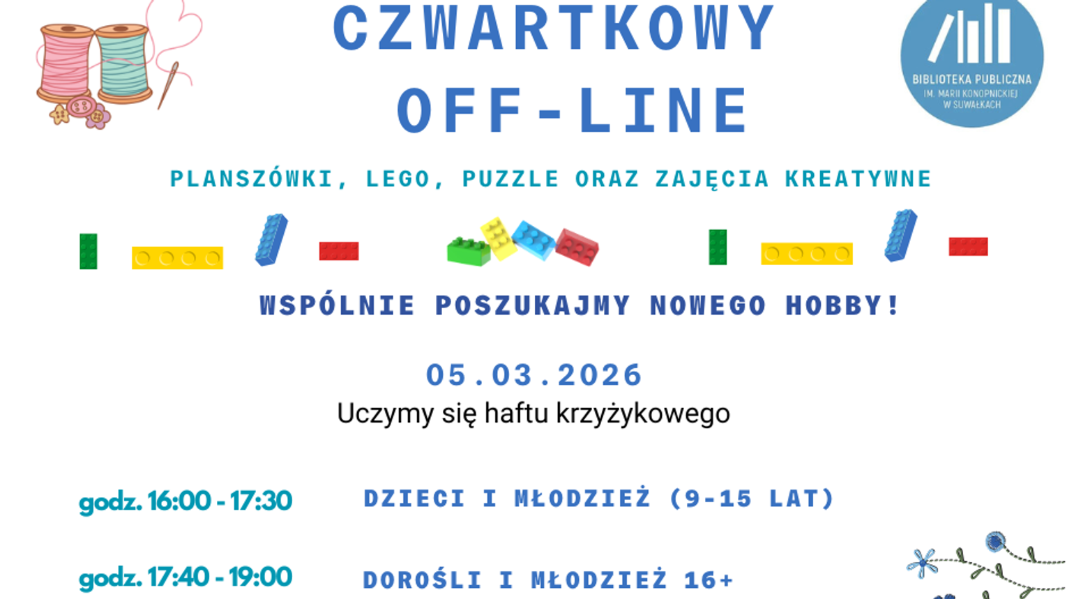 Zajęcia odbywają się w pierwszy czwartek miesiąca o godz. 16.00 w Pracowni „Smykałka”.