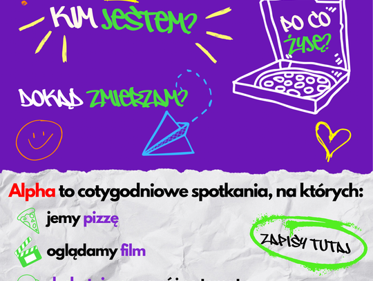 Alpha to cykl 8 spotkań odbywających się w kolejne wtorki. Każde spotkanie obejmuje wspólną kolację (darmowa pizza), integrację, film poruszający tematy życia, wiary i codzienności oraz otwartą dyskusję.