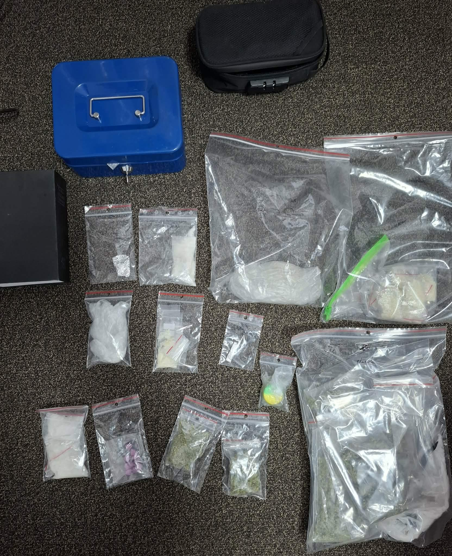 Policjanci zabezpieczyli torebki ze skrystalizowaną białą substancją, pojemniki z suszem roślinnym oraz tabletki. Wstępne badanie narkotesterami wykazało, że była to marihuana, ekstazy oraz tzw. „kryształ” – substancja o działaniu psychoaktywnym.