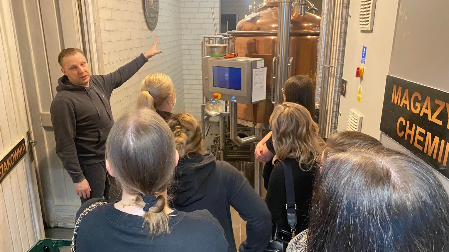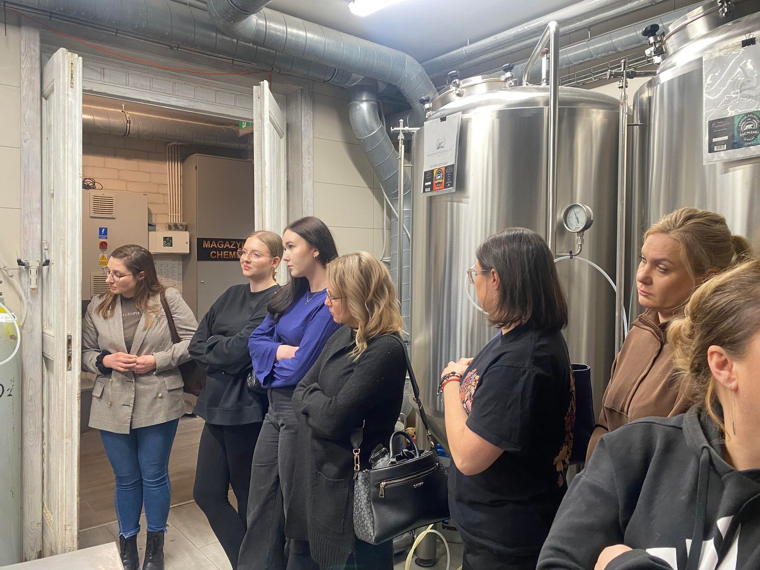 Podczas spotkania uczestnicy mogli zobaczyć z bliska, jak wygląda proces produkcji piwa oraz jakie etapy technologiczne prowadzą od surowców do gotowego produktu.