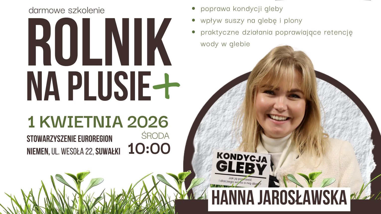 Zapraszamy na szkolenie „Kondycja gleby i przeciwdziałanie suszy”, które odbędzie się 1 kwietnia 2026 r. (środa) o godz. 10:00 w Stowarzyszeniu EUROREGION NIEMEN, ul. Wesoła 22, 16-400 Suwałki.